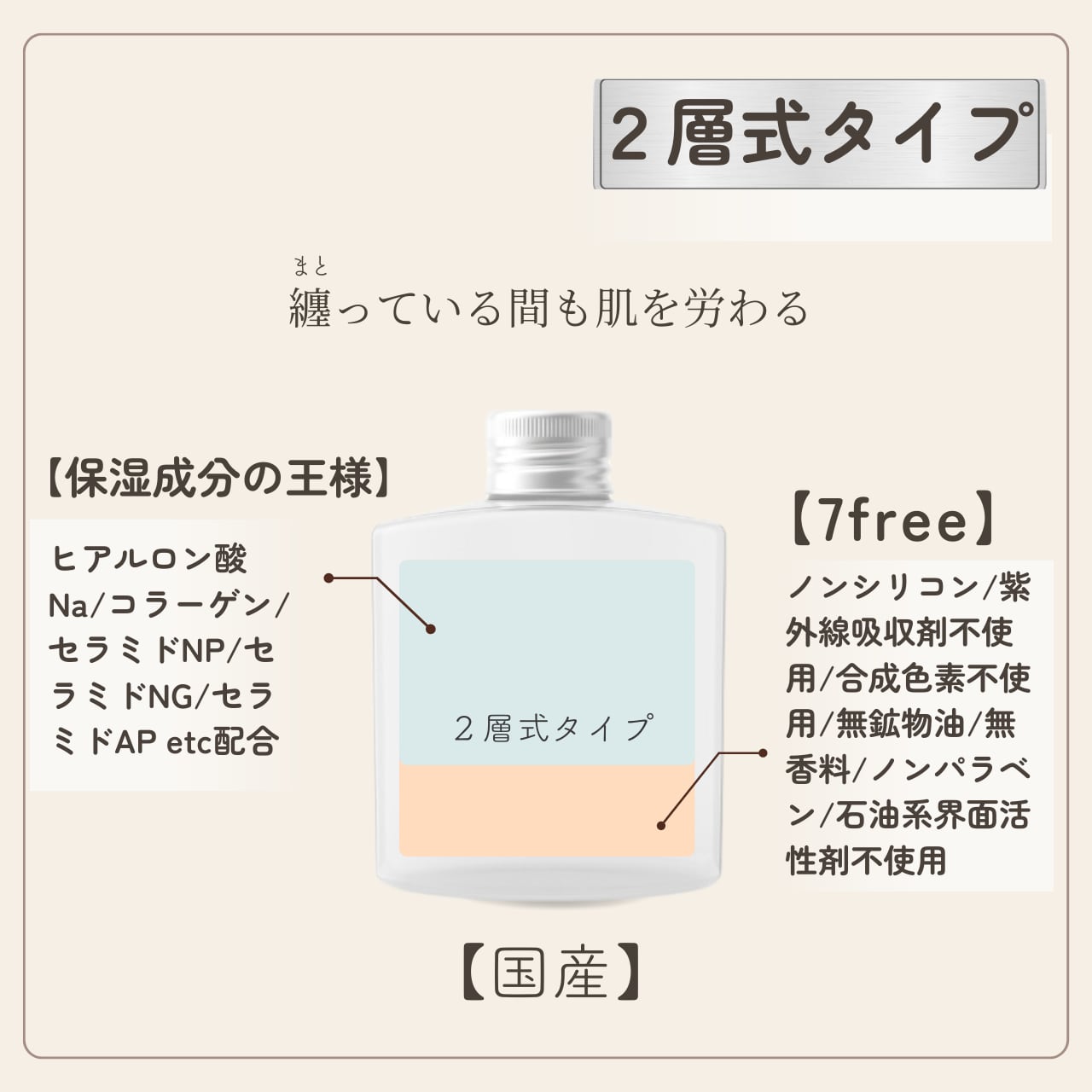 ・ノンケミカル処方で2層式タイプで7つのフリーの安心設計。