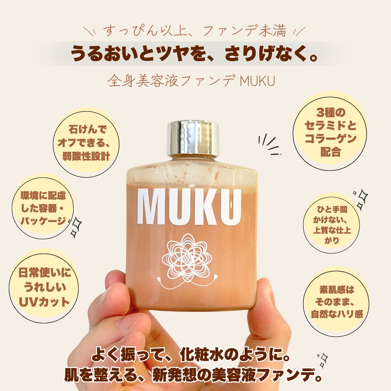MUKUは、全身に使える美容液ファンデーション。 素肌感を大切にしながら、気になる部分を自然に整え、 うるおいと透明感をそっと添えます。